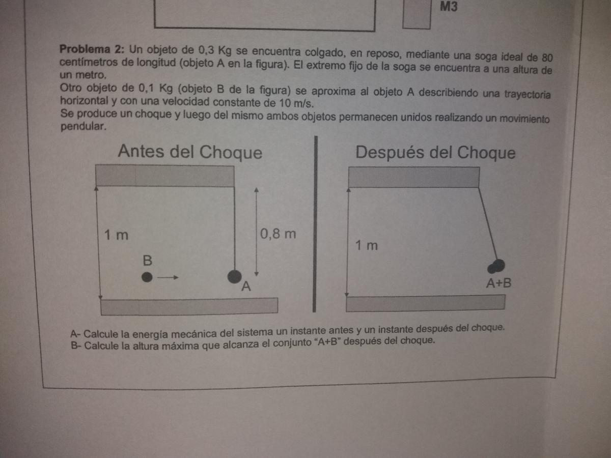 Planteas la expresión de la energía mecánica de los dos bloques pegados cuando alcanzan su altura máxima (observa que en este instante su velocidad es nula, por lo que tienes solamente energía potencial gravitatoria), y queda (observa que consideramos que el módulo de la aceleración gravitatoria terrestre es: g = 10 m/s2):