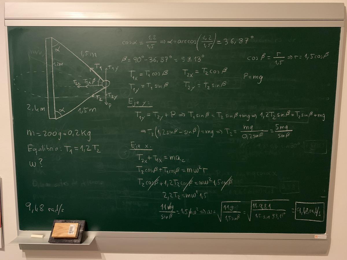 Una masa de 200g sujeta a dos cuerdas de 1,5m de largo que gira alrededor de un palo vertical de 2, 4m a velocidad angular constante. La masa se mantiene en equilibrio cuando la tensión de la cuerda superior es 1,2 veces la de la cuerda interior. ¿Cuanto vale la velocidad angular en este caso?
