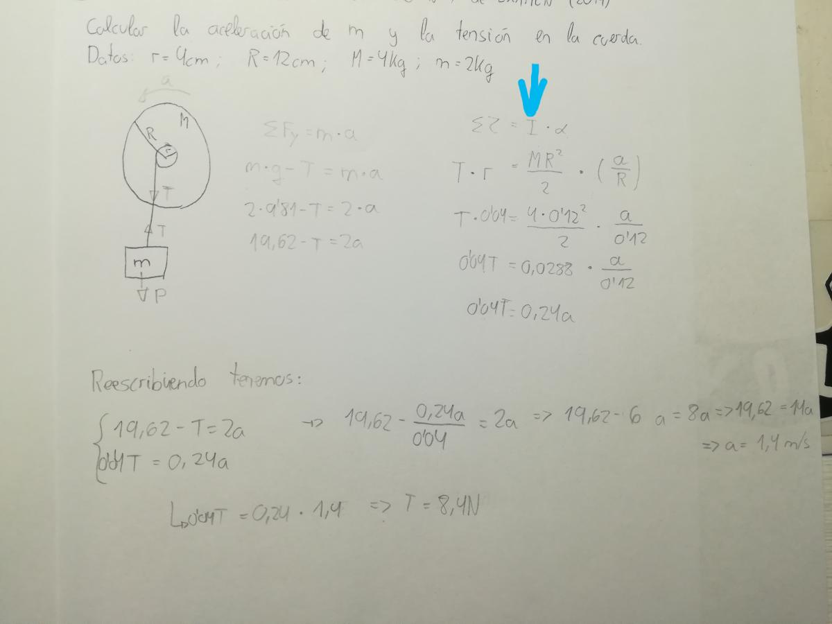 Buenas tardes. Os dejo el enunciado de mi problema relacionado con el tema de torques junto a la resolución que he planteado. Mi única duda es la indicada en azul. Cuando aplico sumatorio de torques igual a momento de inercia por aceleración angular, los datos de cual de las dos poleas son las que tengo que introducir? Yo he introducido los de la polea mas grande, no se si tendría que introducir los de la polea pequeña o incluso sumar los dos momentos de inercia como se hace en otros ejercicios. Digo polea grande/pequeña aunque entiendo que se trata de la misma polea solo que el torque se aplica en el radio pequeño..