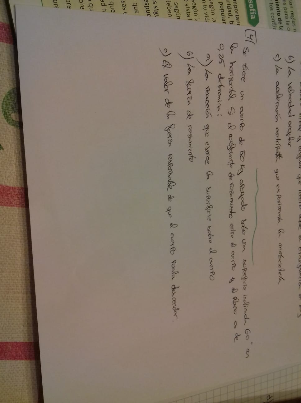 N - M*g*cosθ = 0, de aquí despejas: N = M*g*cosθ (2);