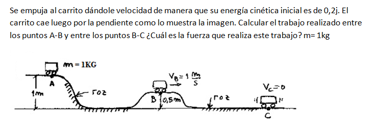 Luego, observa que la única fuerza (aparte del peso) que actúa sobre el carrito es la fuerza de rozamiento que los rieles ejercen sobre él, por los que planteas la ecuación trabajo-energía en los tramos que te indican en tu enunciado, y queda: