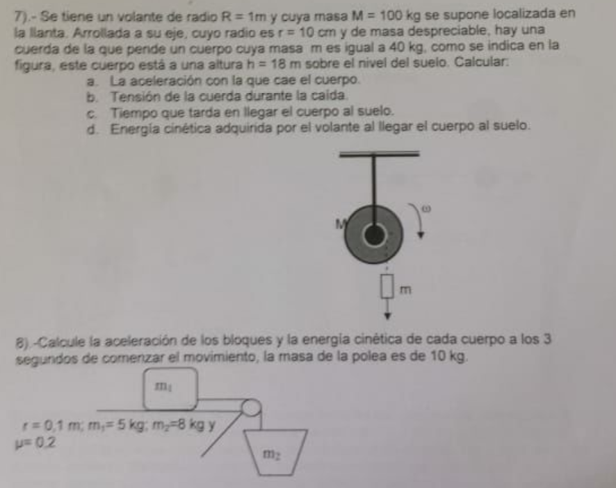 Luego, observa que la aceleración del cuerpo es la aceleración tangencial del eje del volante, y observa también que la única fuerza capaz de producir giro aplicada sobre este volante es la tensión de la cuerda, por lo que planteas la ecuación de momentos de fuerza (torques), y queda: