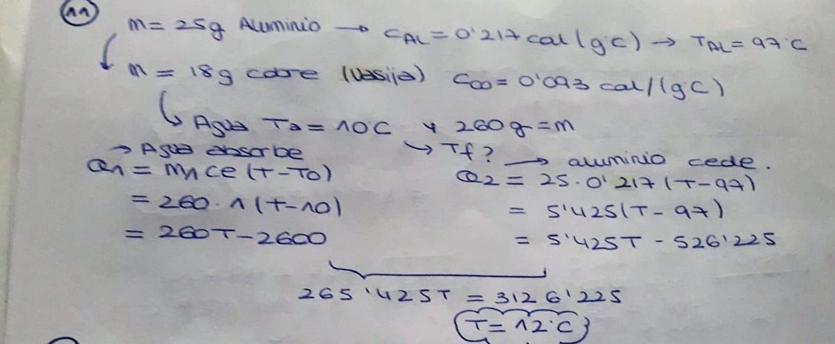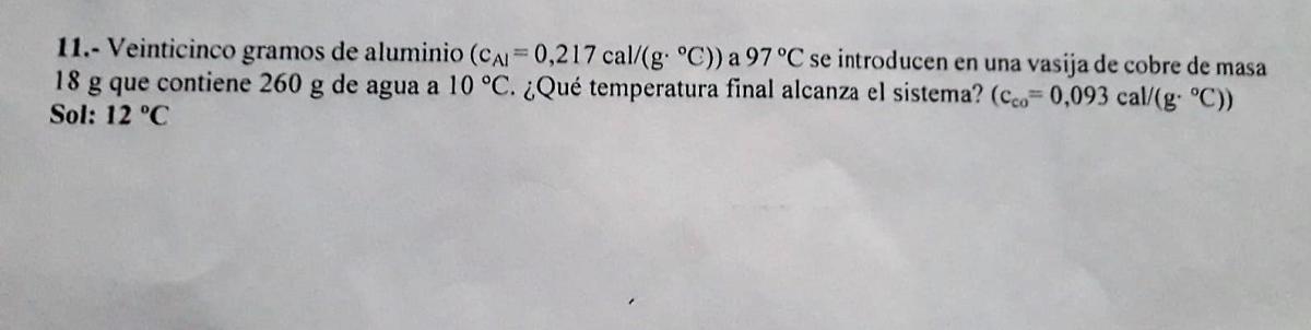 y puedes observar que la cantidad de calor absorbida por la masa de cobre es mucho más pequeña que la cantidad de calor absorbida por la masa de agua, y que también es mucho más pequeña que el valor absoluto de la cantidad de calor cedida por la masa de aluminio, por lo su incidencia en el cálculo del valor de la temperatura final del sistema es apenas perceptible.