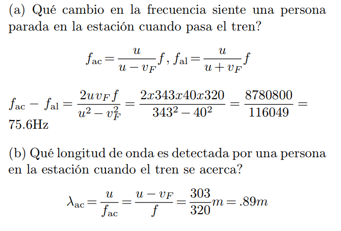 Un tren interurbano pasa por una plataforma de pasajeros a una rapidez de 40 M/seg. El silbato del tren se hace sonar a su frecuencia característica de 320 H z. a. ¿Qué cambio total de frecuencia es detectado por una persona en la plataforma cuando el tren pasa de aproximarse a alejarse? b. ¿Qué longitud de onda es detectada por una persona en la plataforma cuando el tren se aproxima?