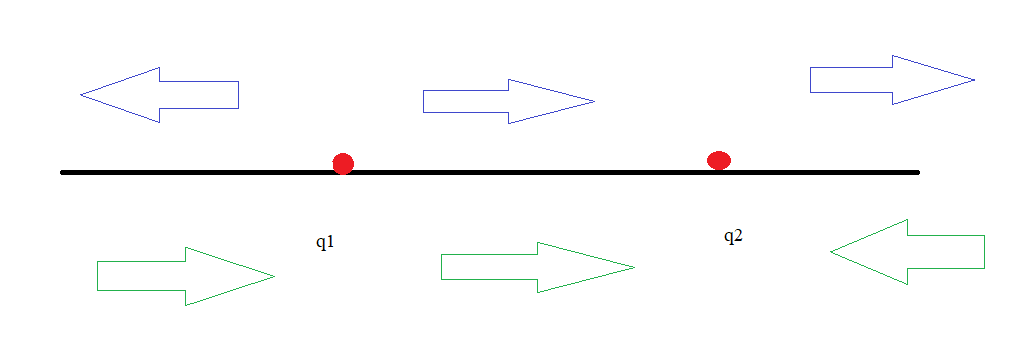 En él puedes ver que he representando en plan cutre xD las lineas de fuerza en azul generadas por la carga positiva q1 y verdes son las generadas por la carga negativa q2