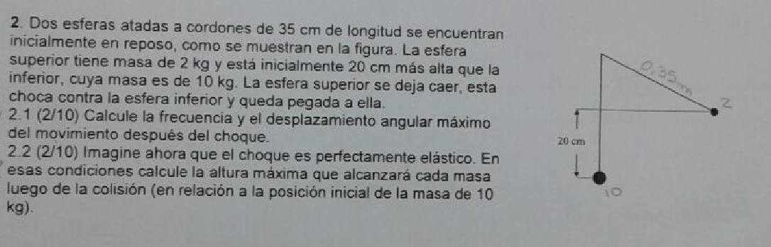 Establece un sistema de referencia con origen en la posición inicial de la esfera más pesada, con eje OX horizontal con sentido positivo hacia la izquierda, y con eje OY vertical con sentido positivo hacia arriba.