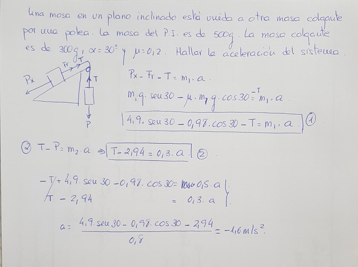 2,94-2,45-0,84=0,8a a= - 0,44m/s2. Como también es negativa la aceleración y ésto no es posible, nos indica que el sistema está en reposo.