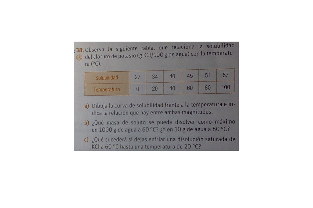 La solubilidad depende de la T. Observando la tabla que nos da la relación entre la T y la solubilidad, se ve que a 60ºC la solubilidad es 45gKCl/100g de agua.