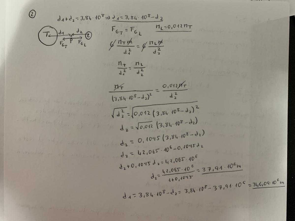 2.- Sabiendo que la distancia entre la Tierra y la Luna es de 3,84 ⋅ 108m, ¿en qué punto debiera situarse un satélite de 10 toneladas para que sea igualmente atraído por ambas? Dato: la masa de la Luna es 0,012 veces la masa de la Tierra