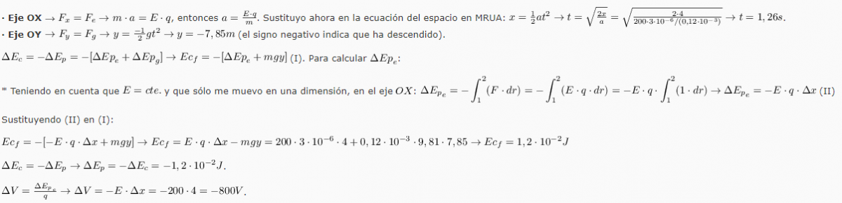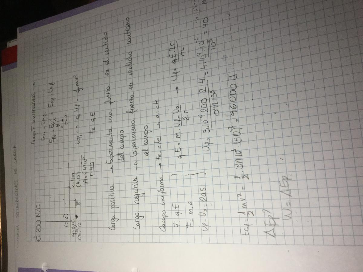 un campo electrico uniforme de intensidad E =200NC^-1esta dispuesto horizontalmente en la direccion de eje ox.Se deja en libertad en el origen y partiendo del reposo una carga de 3microC y m =0.12 g calcula la energia cinética de la carga en x=4