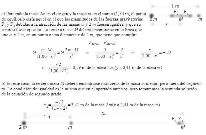 1.- Dos puntos materiales de masas m y 2m respectivamente, se encuentran a una distancia de 1 m. ¿Dónde habrá que colocar otra masa para que esté en equilibrio?