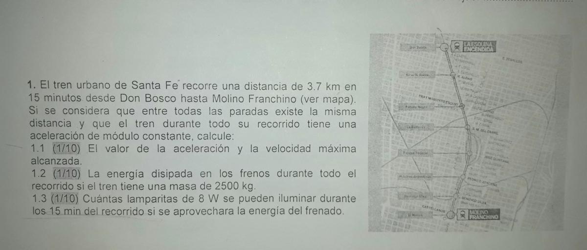 Si el tren no tiene paradas entre los puntos inicial y final de su recorrido, es razonable pensar que acelera durante la primera mitad de su recorrido (18,5 Km, tardando 7,5 min), y que desacelera durante la segunda mitad, con velocidad inicial y velocidad final nula.