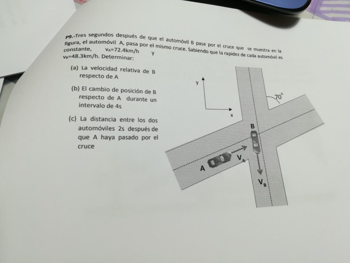 VB/A = VB - VA ≅ < 0 , -48,3 > - < 68,034 , 24,762 > ≅ < -68,034 , -73,062 > (en Km/h).