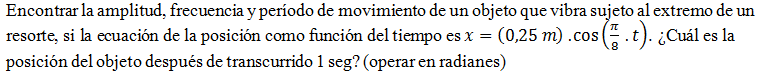 Para x(t) = 0.25 cos(π/8 t) se tiene entonces que A = ±0.25 m ω = π/8 rad/s y φ = 0 rad