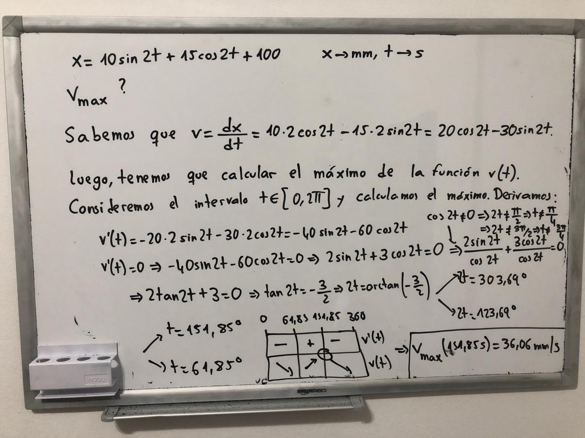 El movimiento vertical de una masa unida a un resorte se expresa mediante la relación x = 10sin2t+15cos2t+100 , donde x y t se expresan en mm y s, respectivamente. Calcular la velocidad máxima que alcanza la partícula