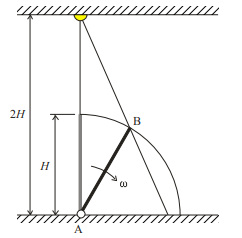La figura representa una lámpara encendida, situada a una altura 2H sobre el suelo. La varilla AB de longitud H gira uniformemente con velocidad angular ω partiendo de la vertical. Hállese la velocidad de la sombra del extremo B de la varilla
