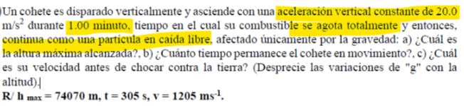 Calcula la altura alcanzada y velocidad final en el primer tramo, mientras asciende con esa acelaracion de 20 m/s².