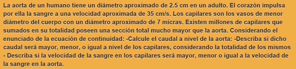 Luego, si consideras que la sangre es un líquido incompresible, tienes que los caudales son iguales, por lo que puedes plantear: