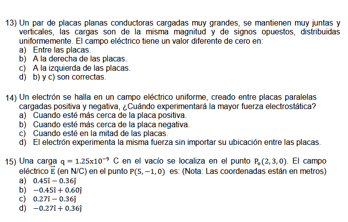 13) La respuesta correcta es la a porque los campos se suman. Haz un dibujo y lo verás. Si la placa izquierda es la de carga positiva sus líneas de campo en el interior irán de izquierda a derecha y en la placa cargada negativa ocurre lo msimo: sus líneas de campo van de izquierda a derecha.