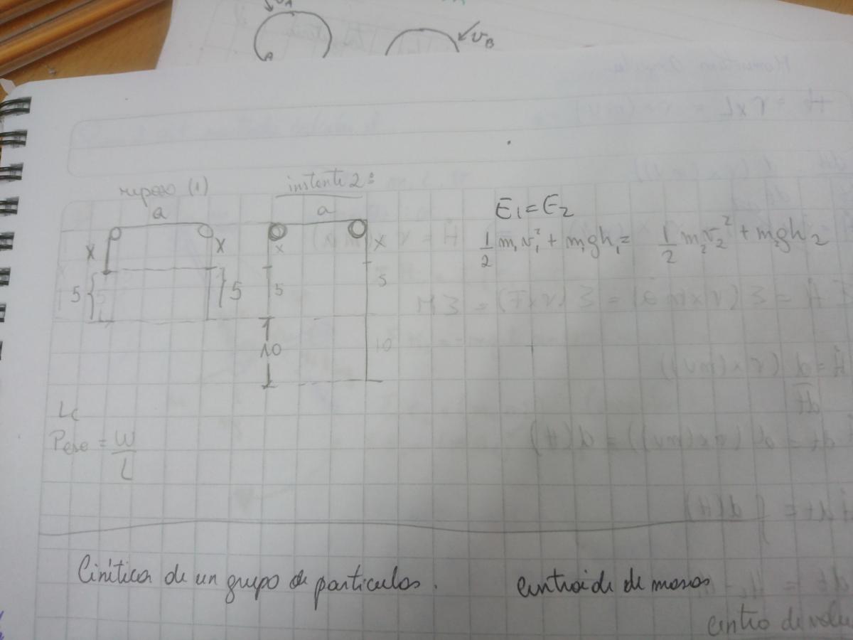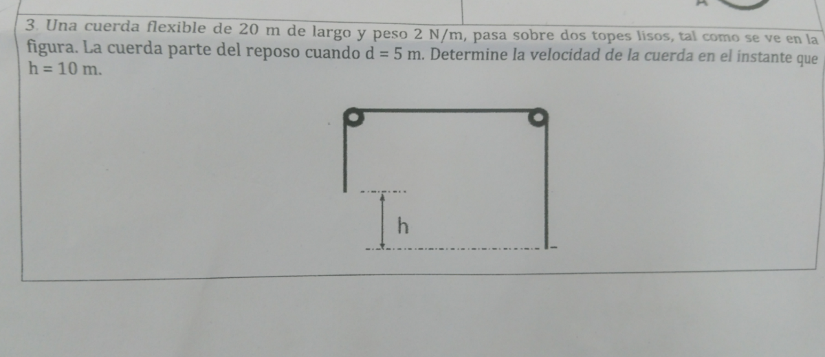 una cuerda flexible de 20 m de largo y peso 2N/m, pasa sobre dos topes lisos , tal como se ve en la figura . la cuerda parte del reposo cuando d=5m. Determine la velocidad de la cuerda en el instante que h=10m.