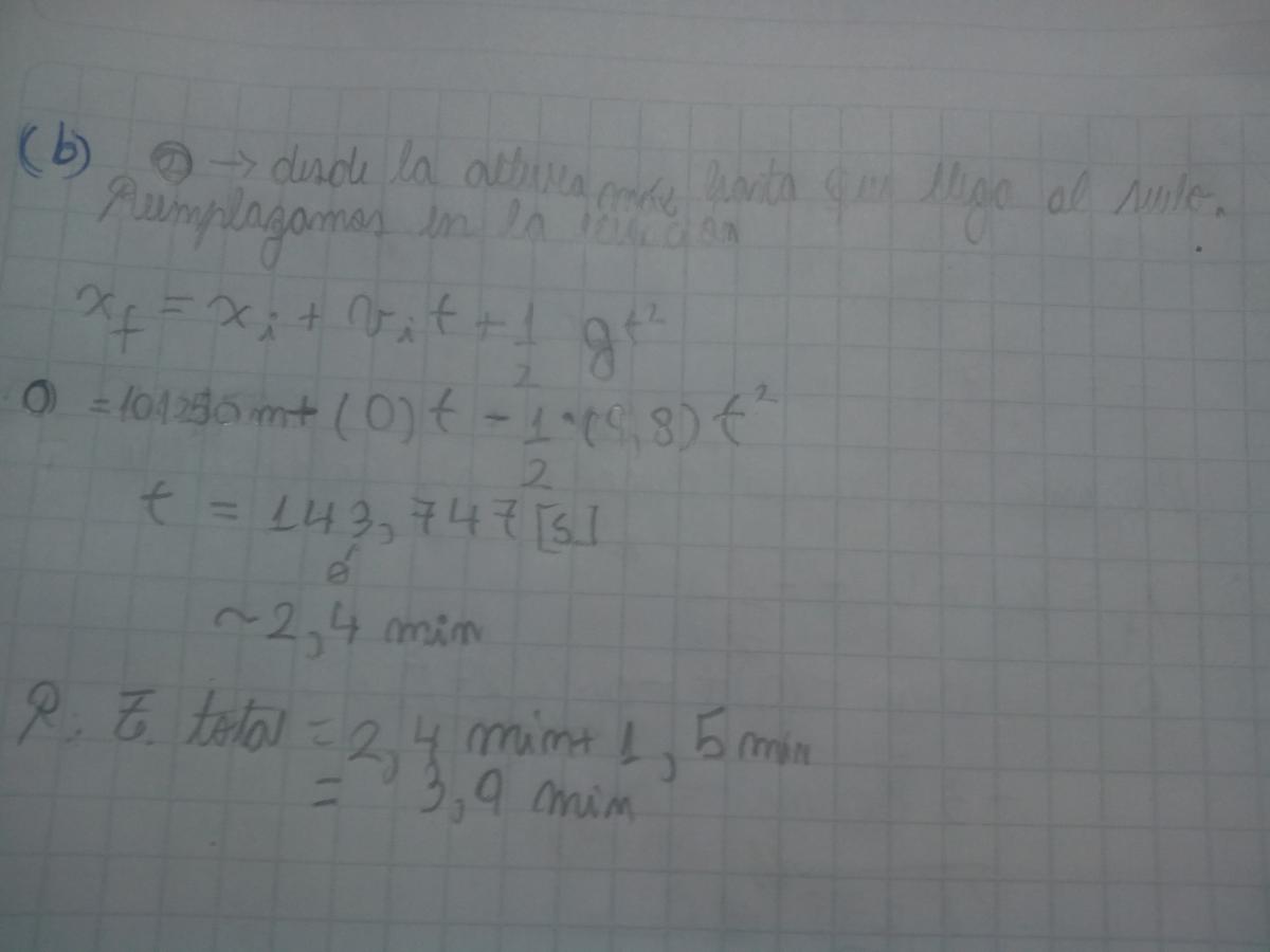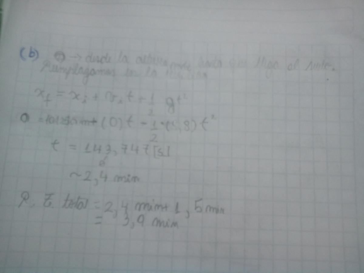 Hola David la altura que calculaste en el ítem A solo es la altura que tendrá el cohete al transcurrir los 1,50 min. necesitas averiguar cual es su velocidad final al terminar el combustible osea cuando terminan los 1,50 min y tomar esa como su velocidad inicial para continuar desplazándose, luego sumas las dos alturas que necesitas y tenes la altura máxima... con respecto al tiempo nos dice que no influye la resistencia del aire ni la gravedad así que tenés que calcular solo el tiempo de caída y multiplicar por 2 ya que el tiempo de subida es el mismo que el tiempo de caída.