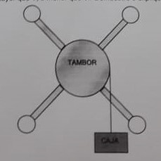 Una polea complicada consiste en cuatro esferas idénticas colocadas en los extremos de rayos que se prolongan desde un tambor giratorio. Una caja está unida a una cuerda delgada y ligera que se enrolla en el borde del tambor. Cuando se libera del reposo, la caja adquiere una rapidez V después de caer una distancia d. Ahora las cuatro esferas se mueven hacia adentro más cerca del tambor, y de nuevo la caja se suelta del reposo. Después de caer una distancia d, su rapidez será igua