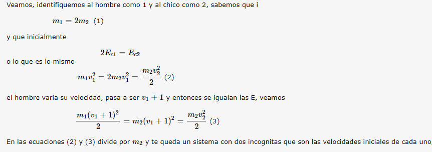Ejercicio 2: Un hombre que corre tiene la mitad de la energía cinética que un niño, de la mitad de la masa que él posee. El hombre aumenta su velocidad en 1.00 m/s de modo que ahora tiene la misma energía cinética que el niño. ¿Cuáles eran las velocidades originales del hombre y del niño?