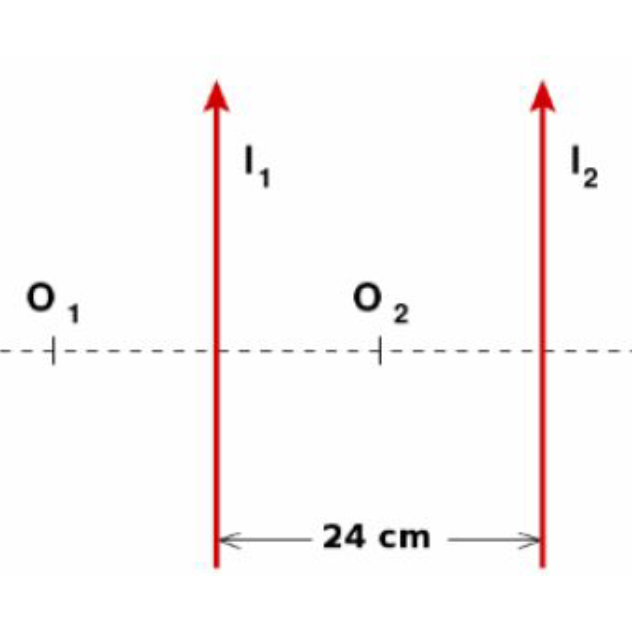 1.- Dos conductores rectilíneos, paralelos y muy largos están separados por una distancia de 24 [cm]. Por los conductores pasan corrientes eléctricas en el mismo sentido de intensidades I1= 18[A] y I2= 25[A]. Determine el campo magnético en los puntos 01 y 02 ubicados a 12 [cm] del conductor que transporta a I1.