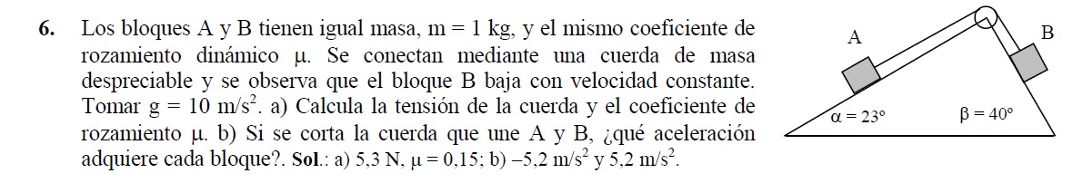 en un plano horizontal dos bloques unidos por una cuerda. Del primer bloque A se tira con una fuerza horizontal de 200 N, la masa de cada cuerpo es 20kg y el coeficiente de rozamiento dinamico 0,1, calcula la tension del cable
