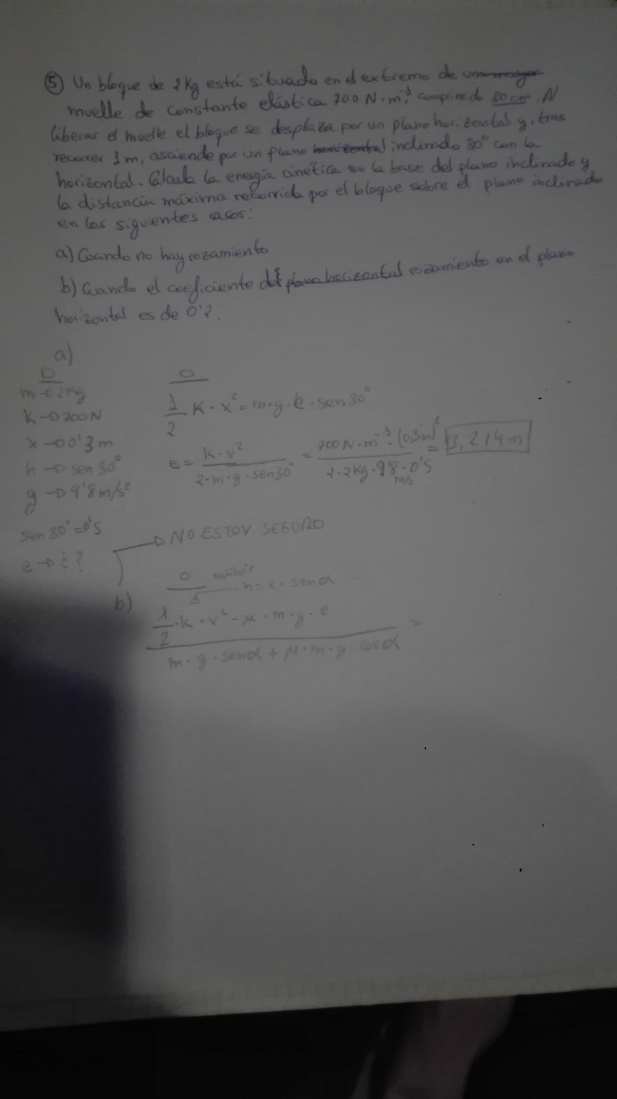 Un bloque de 2Kg esta situado en el extremo de un muelle, de constante elástica 750N·m-¹, comprimido 30cm. Al liberar el muelle el bloque se desplaza por un plano horizontal y, tras recorrer 1m, asciende por un plano inclinado 30° con la horizontal. Calcula la energia cinetica en la base del plano inclinado y la distancia máxima recorrida por el bloque sobre el plano inclinado en los siguientes casos: