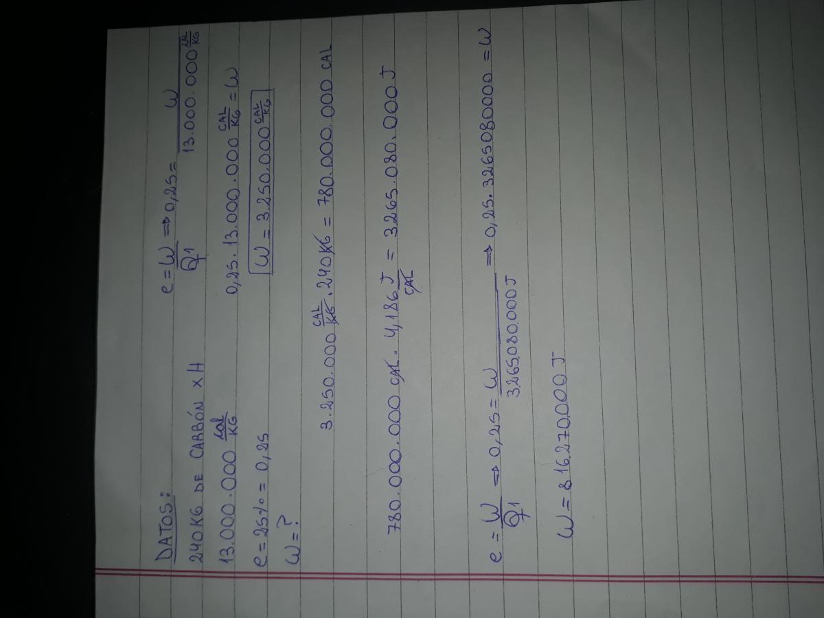 Una maquina termica consume 240 kg de carbon por hora, siendo el poder calorifico de 13.000.000 cal/kg de este combustible. Si la maquina tien un rendimiento del 25%, calcule el trabajo suministrado por la maquina y el calor cedido al foco frio en una hora.![]()
