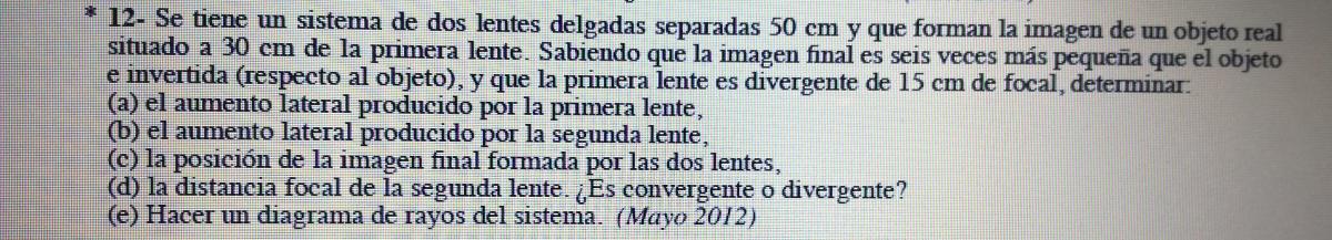 Hola Laura..el ejercicio es muy largo, y para resolvertelo por aqui necesitaria mil años..te recomiendo que vea sel vídeo de lentes y los ejercicios resueltos que hay en el material adicional para que plantees tu ejercicio de dos lentes que no es propio de bachiller