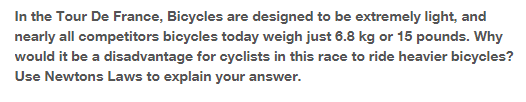 3) Por la segunda ley de Newton, F=m*a. Para una aceleración dada, como más masa pongas, se necesitará una fuerza más grande. Si un ciclista tiene una bici que es dos veces más pesada que otra, entonces cuando se necesite acelerar una aceleración de a, con la bici menos pesada se hará una fuerza F y con la pesada 2F para acelerar. También es un problema al frenar.