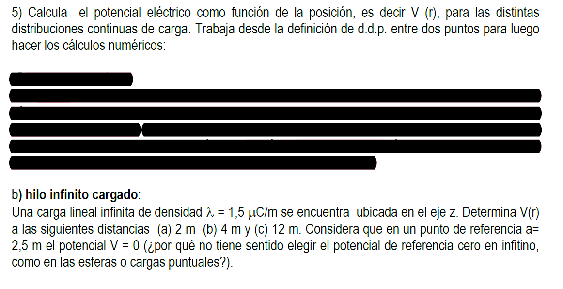 Observa que la configuración de la carga (distribución lineal uniforme) condujo a una expresión del potencial que toma valores negativos con valores absolutos cada vez más grandes a medida que se consideran puntos más alejados del hilo conductor cargado.