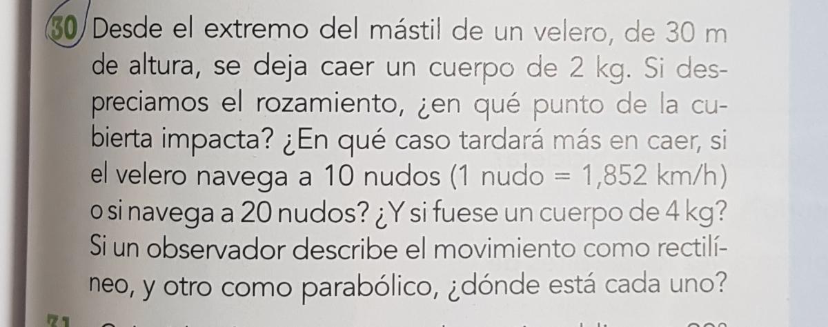 xi = 0, yi = 30 m, vx = vv (constante, rapidez del velero con respecto a tierra), vyi = 0, ay = -10 m/s2.