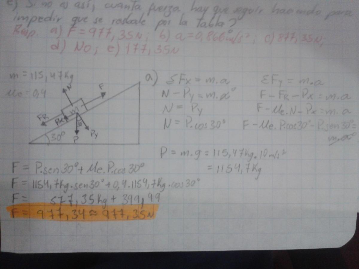 ayudenme en este ejercicio unicoos!, tengo una duda respecto a la pregunta e), calcule la fr para saber cuanta fuerza  tengo que ejercer para que el refrigerador no se deslice sobre la tabla, pense que restando algunas de las fuerzas calculadas en a) y c) me daria el resultado pero no!. ayudenme por favor!!