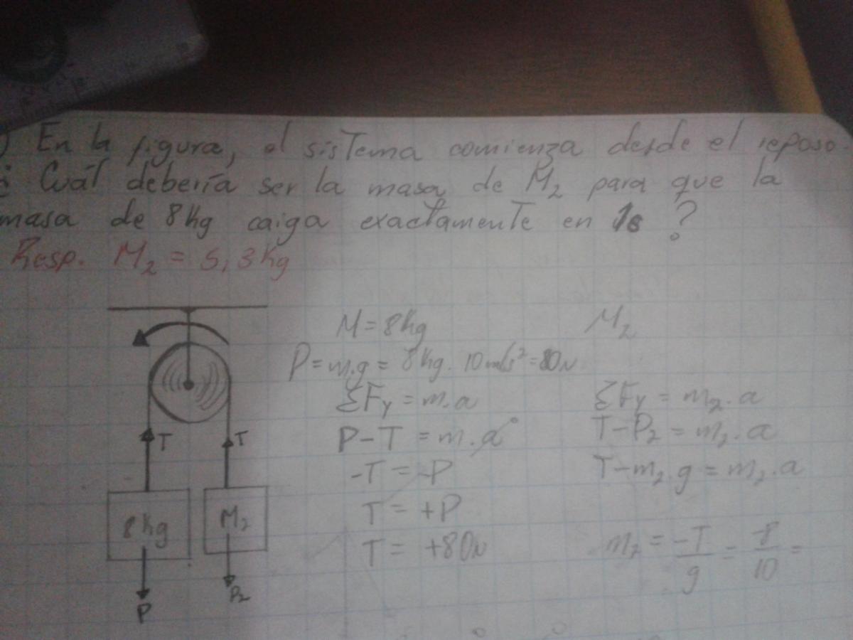 buenas unicoos, podrian ayudarme en este ejercicio!. dice: en la figura, el sistema comeinza desde el reposo. ¿cual deberia ser la masa de M2 para que la masa de 8 kg caiga exactamente en 1 s?. Resp= 5,3kg ![]()