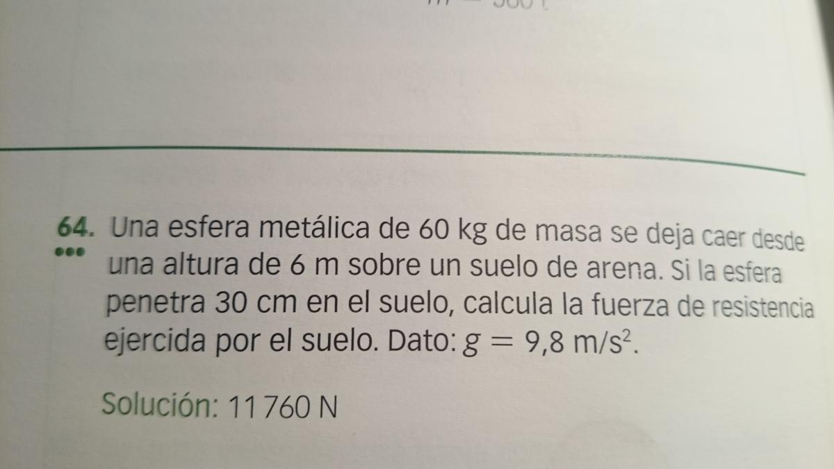 Luego, planteas la expresión del trabajo de la fuerza de resistencia (observa que su dirección es vertical, y que su sentido es opuesto al sentido de movimiento de la esfera, y que actúa mientras la esfera penetra en la arena y se desplaza 30 cm hacia abajo, por lo que su desplazamiento es: Δs = -0, 3 m), y queda: