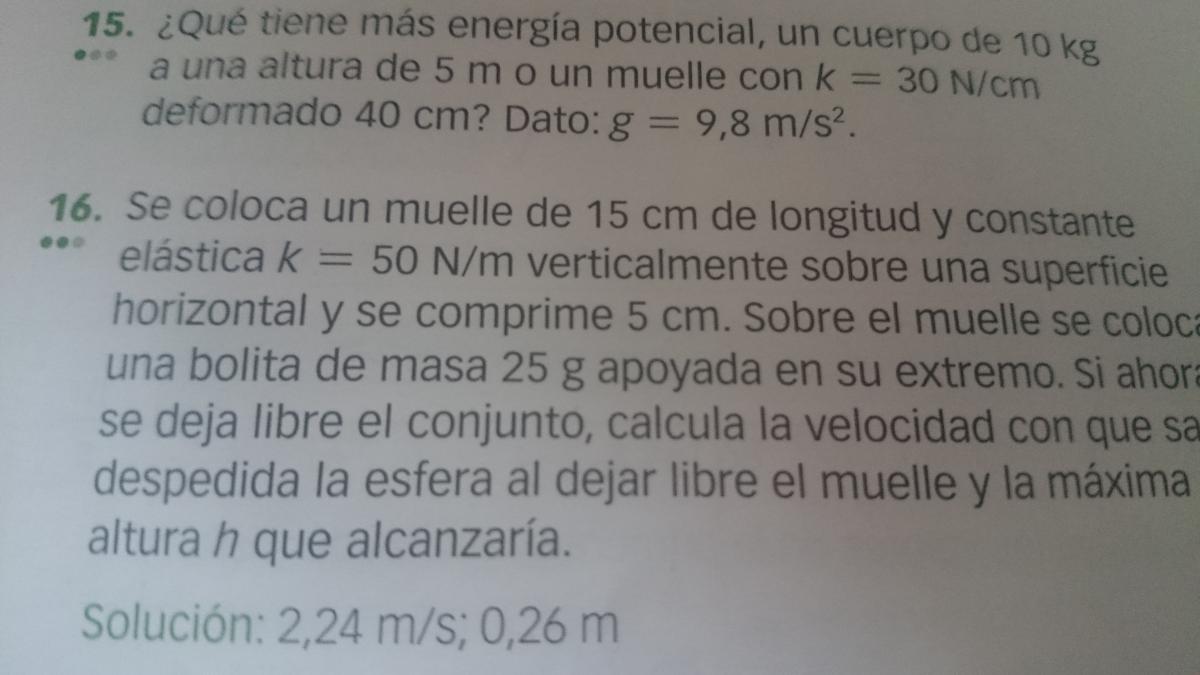 El muelle está relajado (Δs2 = 0), y la bolita está a punto de despegarse del muelle (y2 = 15 cm = 0,15 m, v2 = a determinar);