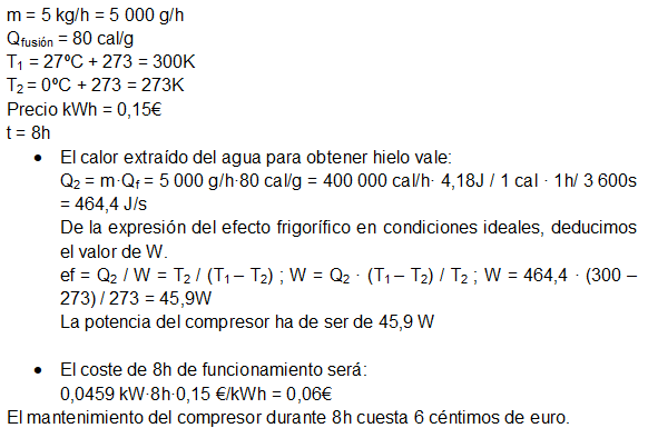 Se utiliza una máquina frigorífica, que funciona según el Ciclo de Carnot, para fabricar 5 kg de hielo por hora, a partir de agua a 0ºC, cuando el ambiente exterior se encuentra a 27ºC. El calor de fusión del hielo es de 80 cal/g. Calcule: