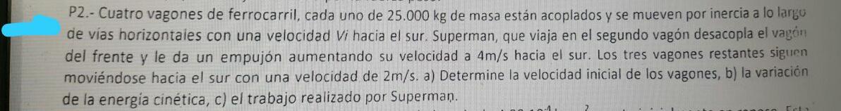 Observa que el personaje es pasajero del tren y que despreciamos su masa por ser mucho menor que la masa del tren o de uno de sus vagones, por lo tanto él aplica fuerzas de igual módulo y de sentido opuesto al primer vagón desacoplado y al resto de la formación (los otros tres vagones), por lo que tienes que la fuerzas aplicadas por el pasajero son internas al conjunto formado por los cuatro vagones y él y, por lo tanto, tienes que no actúan fuerzas exteriores en la dirección de movimiento y el impulsoX (cantidad de movimiento) se conserva.