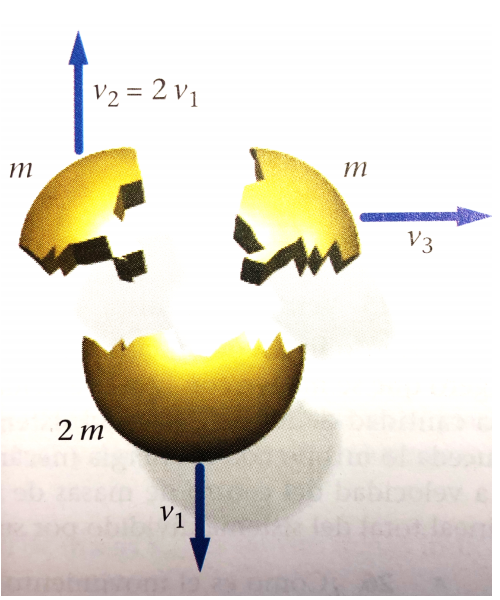 Luego, plantea la cantidad de movimiento final del sistema formado por los tres fragmentos (observa que las velocidades tiene una de sus componentes iguales a cero):