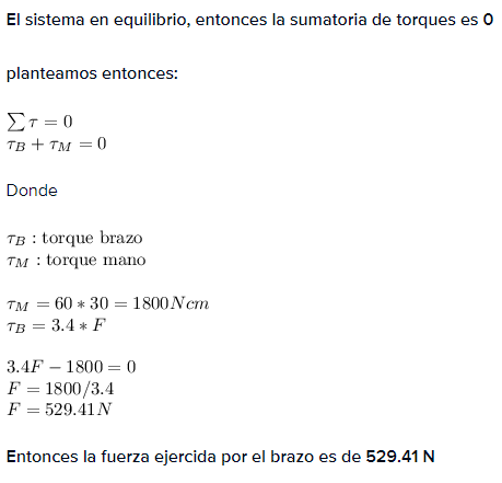 Un peso de 60 N se sostiene en la mano formando el brazo y antebrazo un ángulo de 90º como se muestra en la figura. El músculo bíceps ejerce una fuerza Fm cuya dirección dista 3,4 cm del punto de pivote O en la articulación del codo. Despreciando el peso del brazo y la mano (a) ¿cuál es la magnitud de Fm si la distancia del peso al punto de pivote es de 30 cm? (b) Determinar la fuerza ejercida sobre la articulación del codo por la parte superior del brazo.