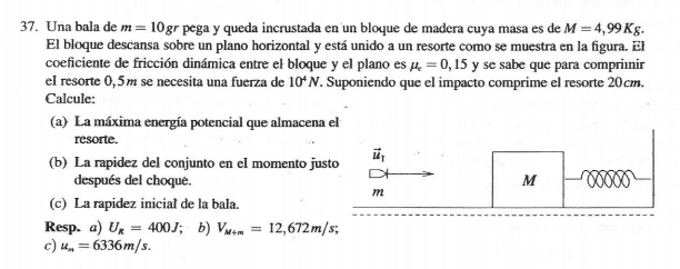 luego, observa que entre los instantes señalados (2) y (3) no se conserva el impulso, ya que actúan fuerzas exteriores al sistema bala-bloque (rozamiento y fuerza elástica), y tampoco se conserva la energía, ya que actúa una fuerza disipativa (rozameniento);