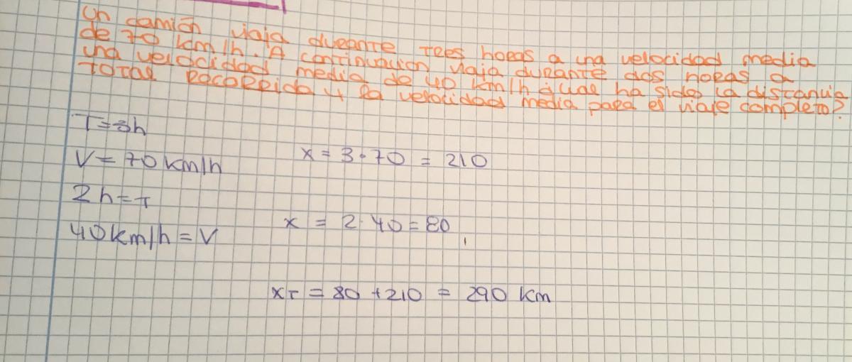 Un camión viaja durante tres horas a una velocidad media de 70 km/h. A continuación viaja durante dos horas a una velocidad media de 40 km/h, ¿cuál ha sido la distancia total recorrida y la velocidad media para el viaje completo?