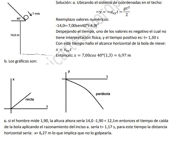 Una bola de nieve rueda del techo de un granero con inclinación hacia abajo de 40º. El borde del techo está a 14 m del suelo y la bola tiene una rapidez de 7.00 m/s al salir del techo. Puede despreciarse la resistencia del aire.