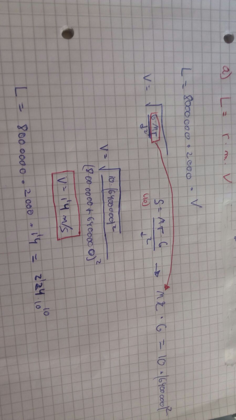 L=r·m·v=(8·106+6,4·106)·2000·v siendo v=√(RT2·g0/r), que seria la velocidad orbital habiendo despejado previamentre la gravedad de la expresión g0=GM/RT2