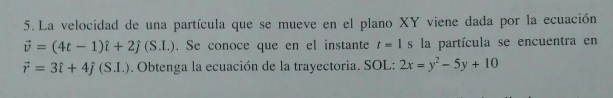Por favor, Podría ayudarme alguien con éste problema de cinemática. El problema consiste en hallar la ecuación de la trayectoria de una partícula. Y para ello te dan como datos la ecuación de la velocidad y la posición de la partícula para el instante t=1. Lo he intentado ya varias veces pero no consigo llegar a la misma ecuación que me indican en la solución del problema, por ello no sé que estoy haciendo mal. Si alguien sabe como resolverlo correctamente, le agradecería que me ilustrara. Saludos y Gracias !!