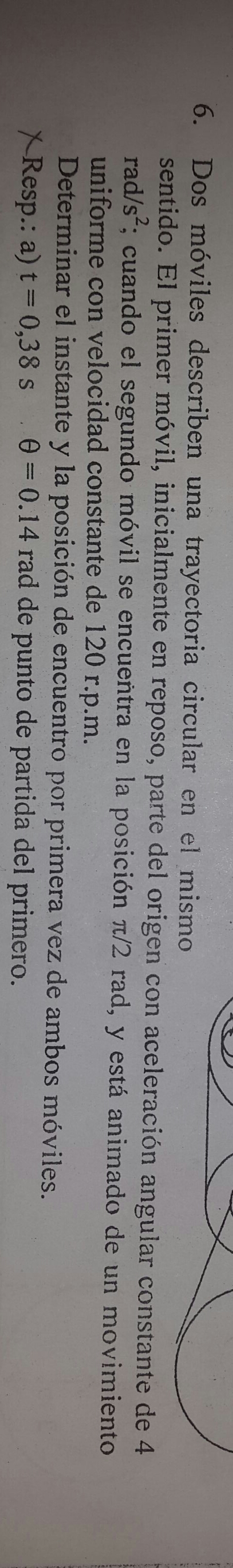 Luego, plantea las ecuaciones de posición angular para ambos móviles (consideramos t = 0 al instante de partida):