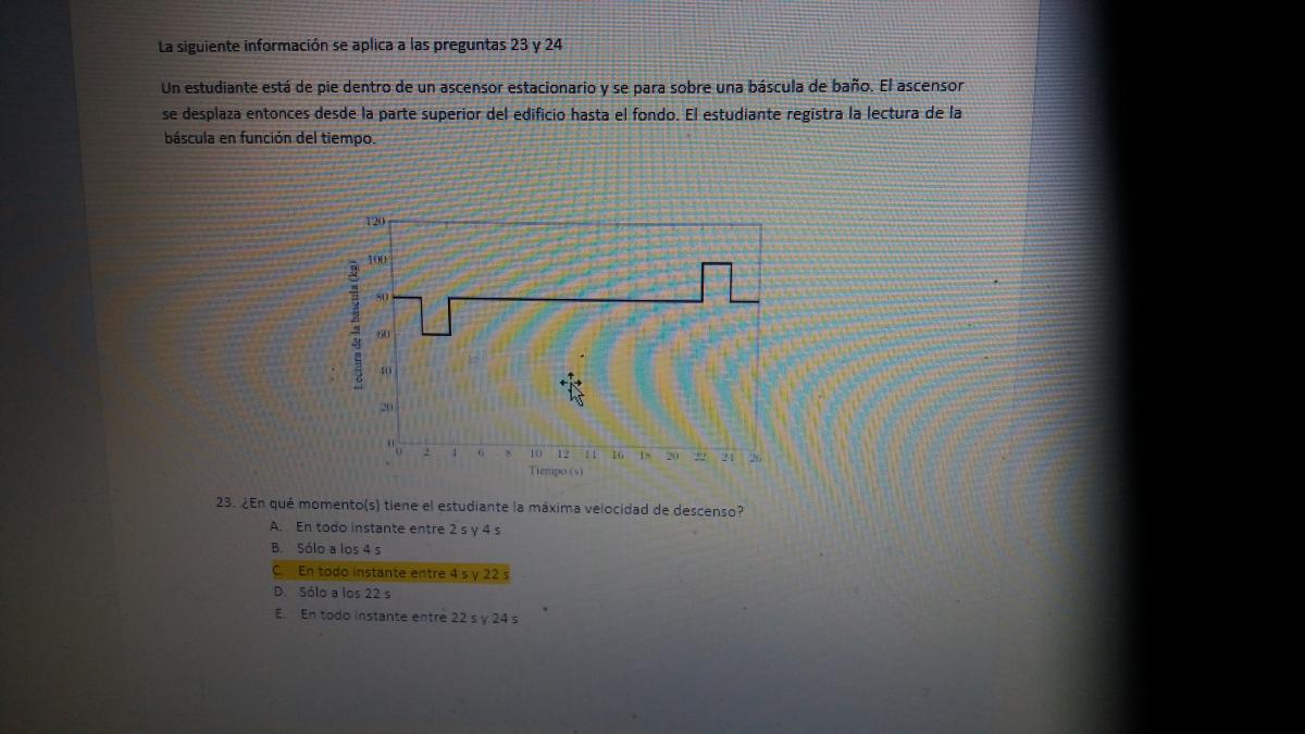 a) periodos donde el elevador está en reposo (de 0 a 2s y de 24 a 26 s) o se mueve con velocidad constante (de 4s a 22s),